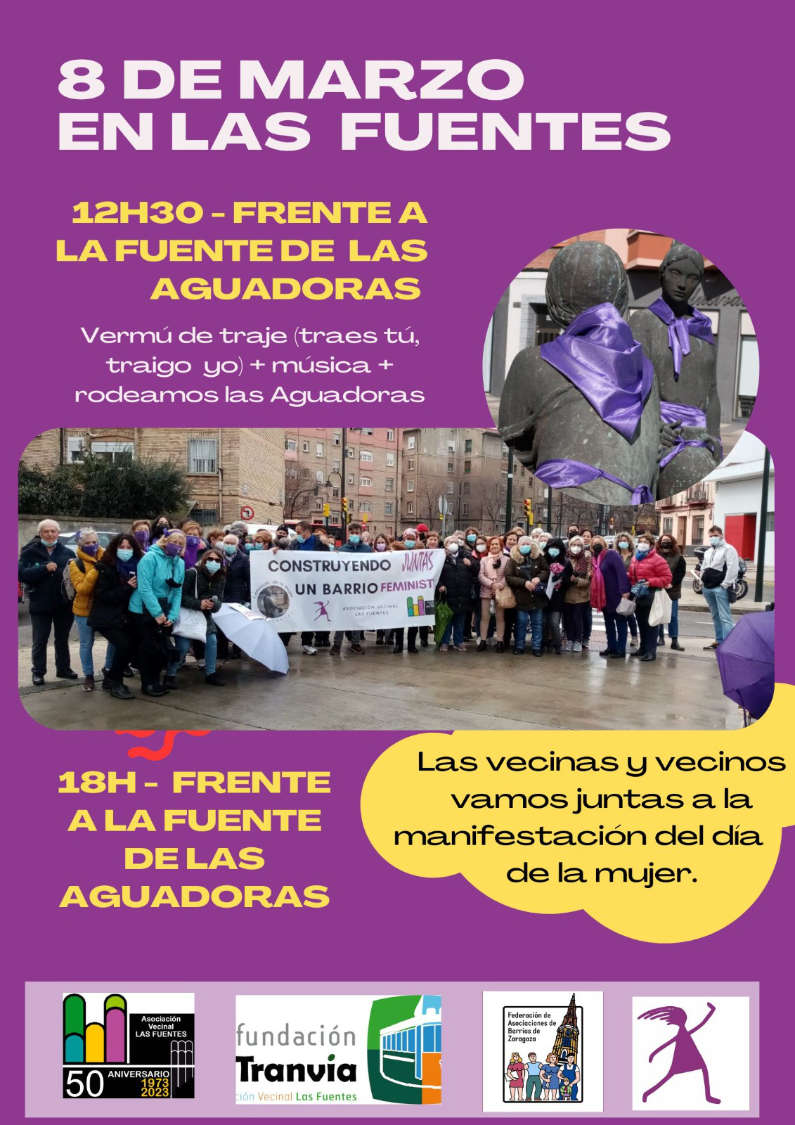 Por la tarde, a las 18:30h. también se ha elegido la Fuente de las Aguadoras como punto de reunión antes de incorporarnos a la manifestación del Día de la Mujer, donde nos juntaremos con las compañeras de la Comisión de la Mujer de la FABZ y vecinos y vecinas de Zaragoza.
