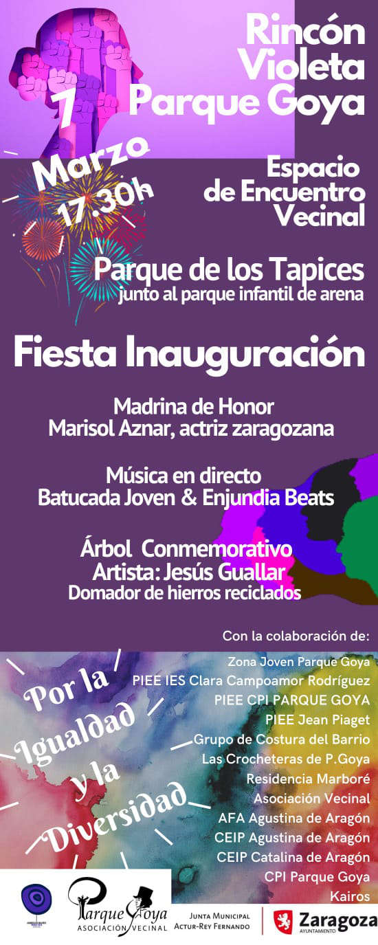 El próximo 7 de Marzo, a las 17:30 horas, realizaremos una Fiesta Inauguración del Rincón Violeta en el Parque Goya, en el Parque de los Tapices, junto al parque infantil de arena.