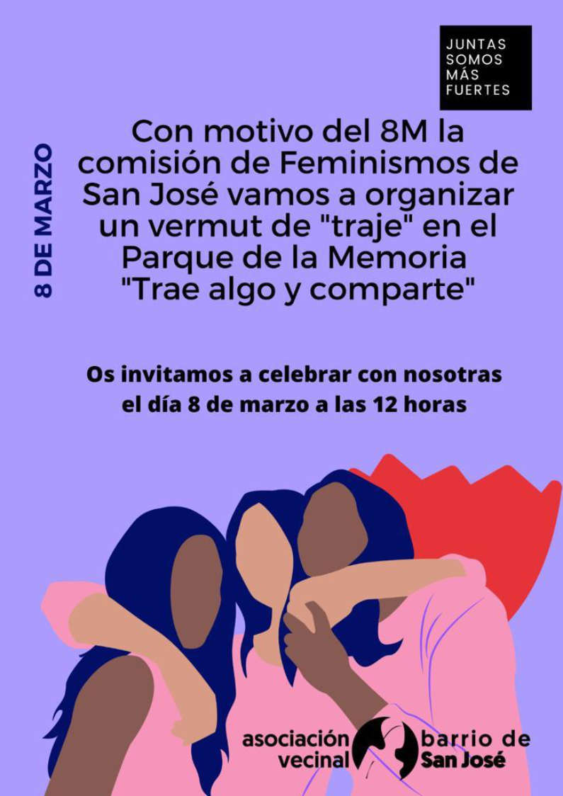 Con motivo del 8M la Comisión de Feminismos de San José vamos a organizar un vermut de «traje» en el Parque de la Memoria «Trae algo y comparte» Os invitamos a celebrar con nosotras el día 8 de marzo a las 12 horas.
