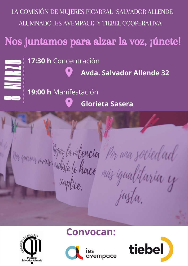La Comisión de Mujeres Picarral-Salvador Allende, el alumnado del IES Avenpace y Tiebel Cooperativa convocan una concentración el 8 de marzo a las 17:30h. en Avenida Salvador Allende, 32 con el lema «Nos juntamos para alzar la voz ¡únete! que confluirá con la manifestación del Día de la Mujer, donde nos juntaremos con las compañeras de la Comisión de la Mujer de la FABZ y vecinos y vecinas de Zaragoza.
