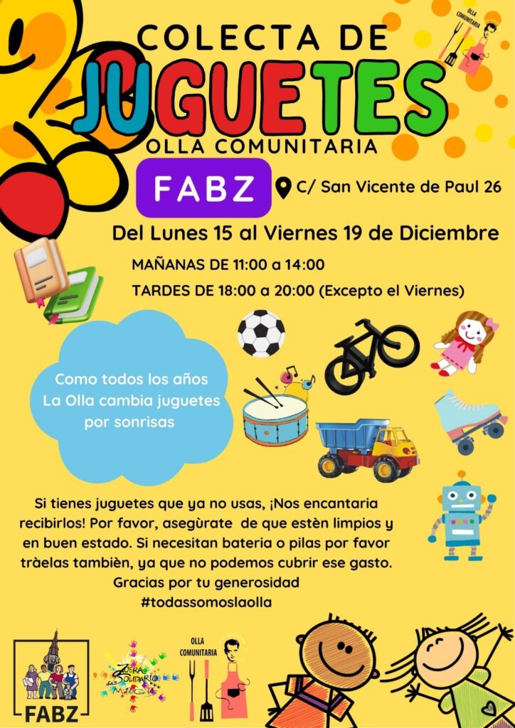 Gracias a una colaboración entre FABZ y la Olla Comunitaria del Gancho, se realiza una colecta de juguetes para familias vulnerables con niños hasta el viernes 19 de diciembre.