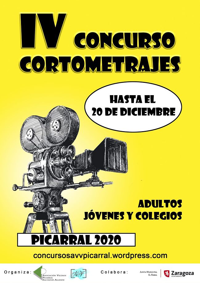 La Asociación Vecinal Picarral–Salvador Allende recuerda que el plazo para presentarse al CONCURSO DE CORTOMETRAJES PICARRAL finaliza el próximo 20 de diciembre. Los cortos deben enviarse al correo: «concursosavvpicarral@gmail.com», adjuntando un fotograma, fragmento de un minuto del corto y los datos correspondientes. El concurso está abierto tanto las personas mayores de 18 años en la categoría adultos, como las menores en la categoría jóvenes y colegios. Los trabajos podrán ser realizados individualmente o en grupo, pudiendo presentar hasta 3 trabajos por participante. Deberán ser originales y no haber sido presentados en anteriores ediciones. (VER Bases completas en web AV. Picarral).