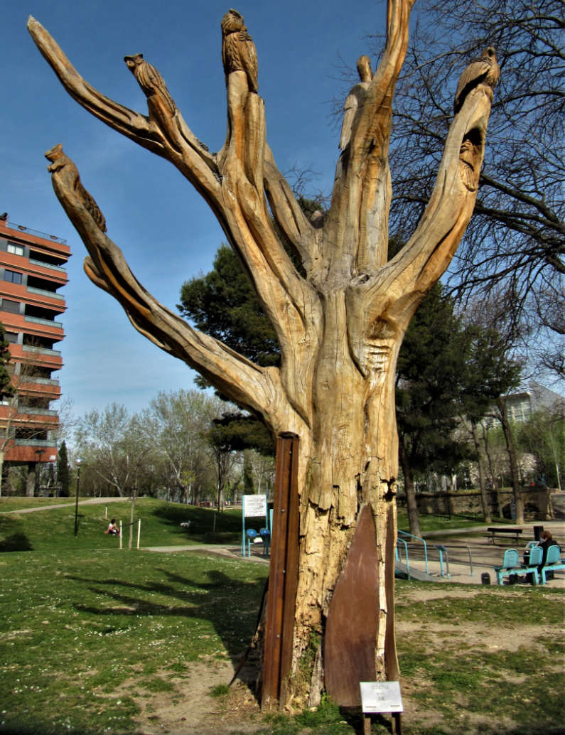 En la mañana de este lunes hemos observado indignados como los Servicios de Parques y Jardines procedían a la tala de la escultura del almez del Parque Bruil, una escultura que fue inaugurada en diciembre de 2017 por parte del Ayuntamiento de Zaragoza como forma de mantener el legado emocional del almez muerto y que había sido catalogado como árbol singular en sesión de Pleno de 28 de octubre de 2005. El escultor soriano José Llorente, que cuenta con numerosos premios de escultura y talla con motosierra, fue el encargado de labrar en el tronco y ramas una estatua tallada en madera que simbolizaba la biodiversidad de la fauna aragonesa: un lobo, dos águilas, dos lechuzas, una ardilla y una cigüeña, conservando la estructura principal del árbol, que en su mejor momento llegó a tener una altura total de 13 metros y un diámetro de copa de 16,30 metros.