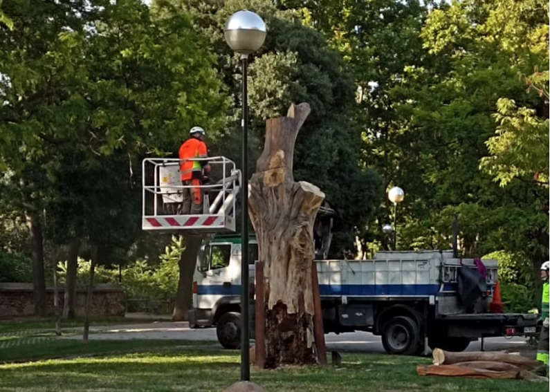 El Servicio de Parques y Jardines del Ayuntamiento de Zaragoza ha talado los restos del almez muerto en el Parque Bruil, declarado en su momento como Árbol Singular y en torno al cual el escultor soriano José Llorente había realizado una intervención escultórica para mantener el recuerdo de este gran árbol. La intervención se he realizado debido al mal estado de los restos de madera, a pesar de las repetidas advertencias de las asociaciones vecinales y de grupos ecologistas de la ciudad y en contra de las propuestas de recuperación. Así lo aseguran en el comunicado enviado a medios, que reproducimos a continuación: