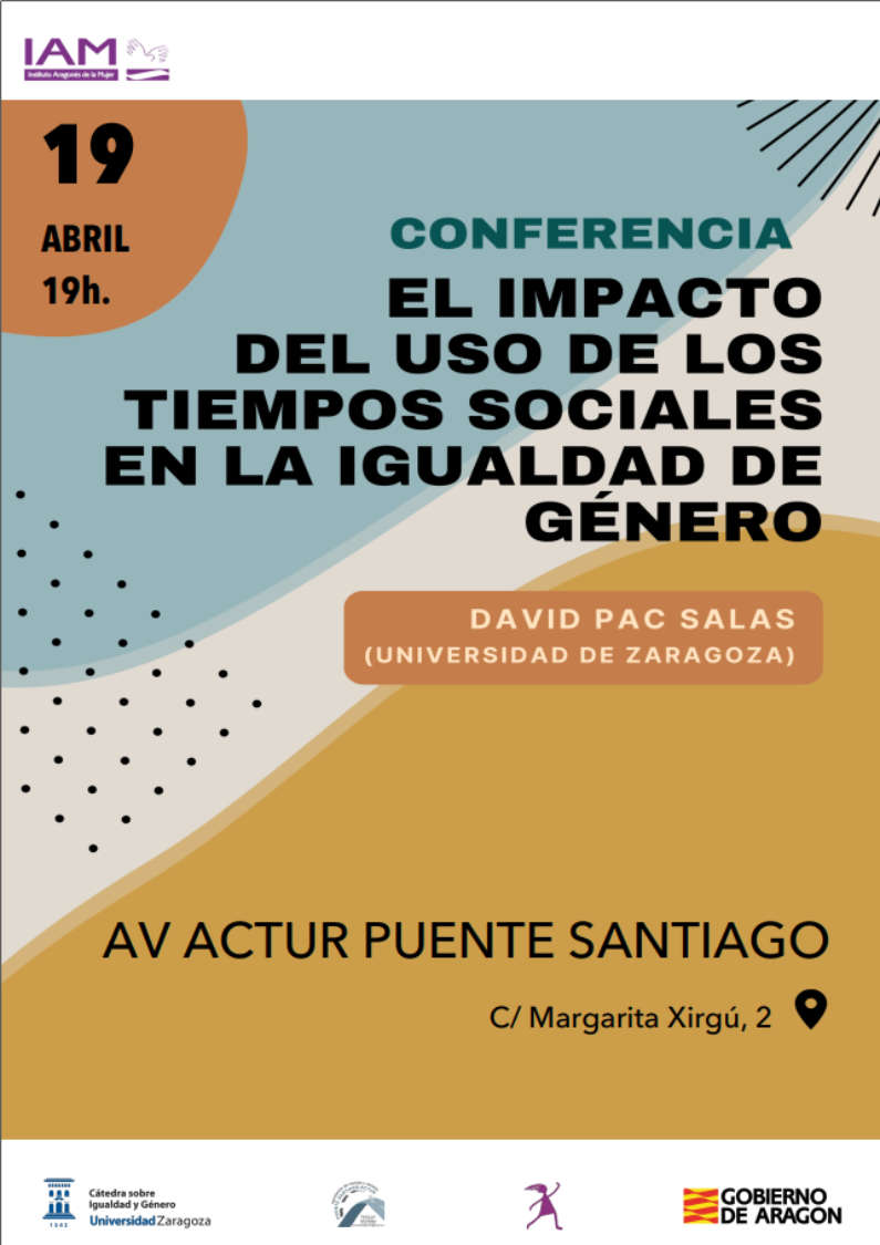 El Miércoles 19 abril a las 19h la ASOCIACIÓN VECINAL ACTUR PUENTE SANTIAGO (C/ Margarita Xirgú, 2) organiza la conferencia de la Cátedra de Género de la Universidad de Zaragoza EL IMPACTO DE LOS USOS DE LOS TIEMPOS SOCIALES EN LA IGUALDAD DE GÉNERO.