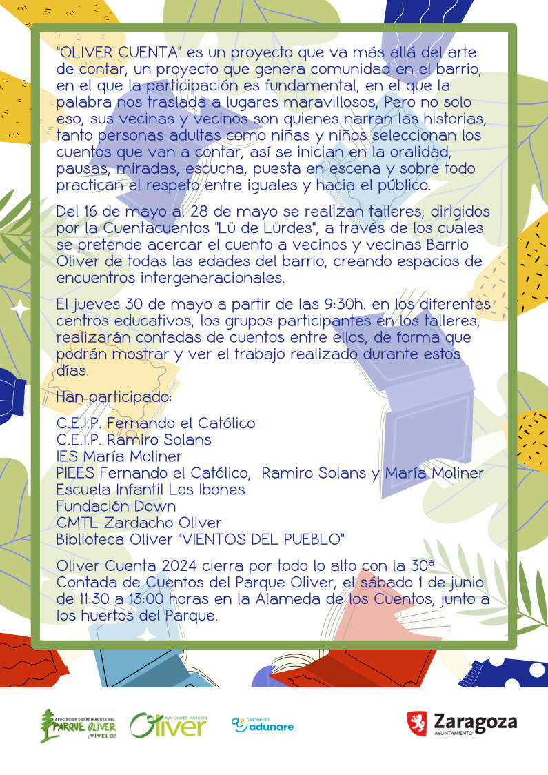 Biblioteca Oliver «VIENTOS DEL PUEBLO»Oliver Cuenta 2025 cierra por todo lo alto con la 31ª Contada de Cuentos del Parque Oliver, el sábado 7 de junio de 11:30 a 13:00 horas en la Alameda de los Cuentos, junto a los huertos del Parque.