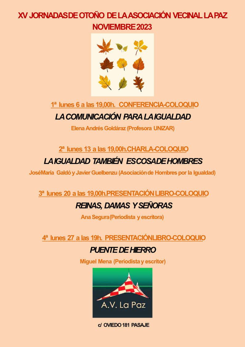 A lo largo del mes de noviembre la Asociación Vecinal La Paz celebra sus Jornadas de Otoño 2023 con varios actos organizados en su sede (calle Oviedo, 181) los lunes a las 19 h.