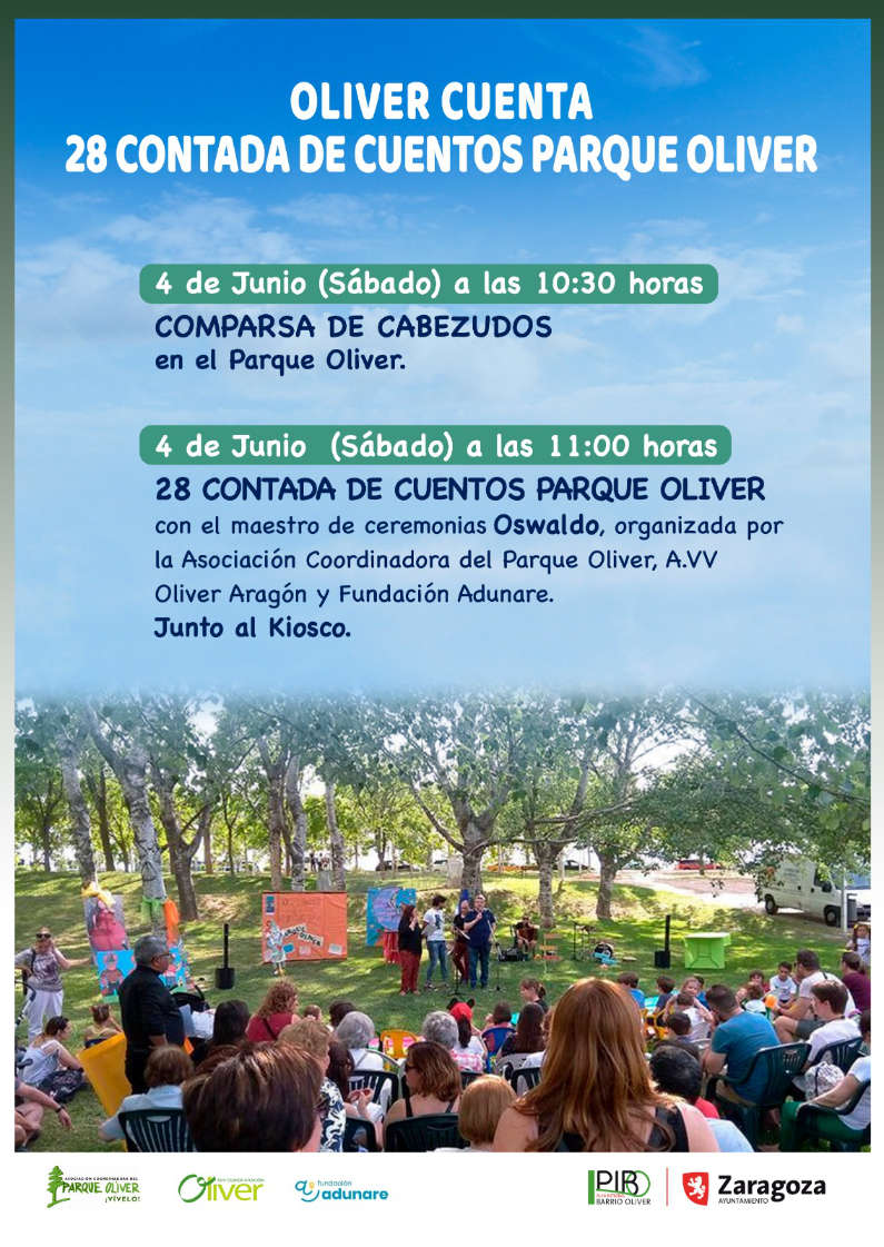 El sábado, 4 de junio a partir de las 10H de la mañana se celebra en el Parque de Oliver “Oliver Cuenta”, la 28 Contada de Cuentos del Parque Oliver, en cuya organización participa la Asociación de Vecinos y Vecinas de Oliver “Aragón”