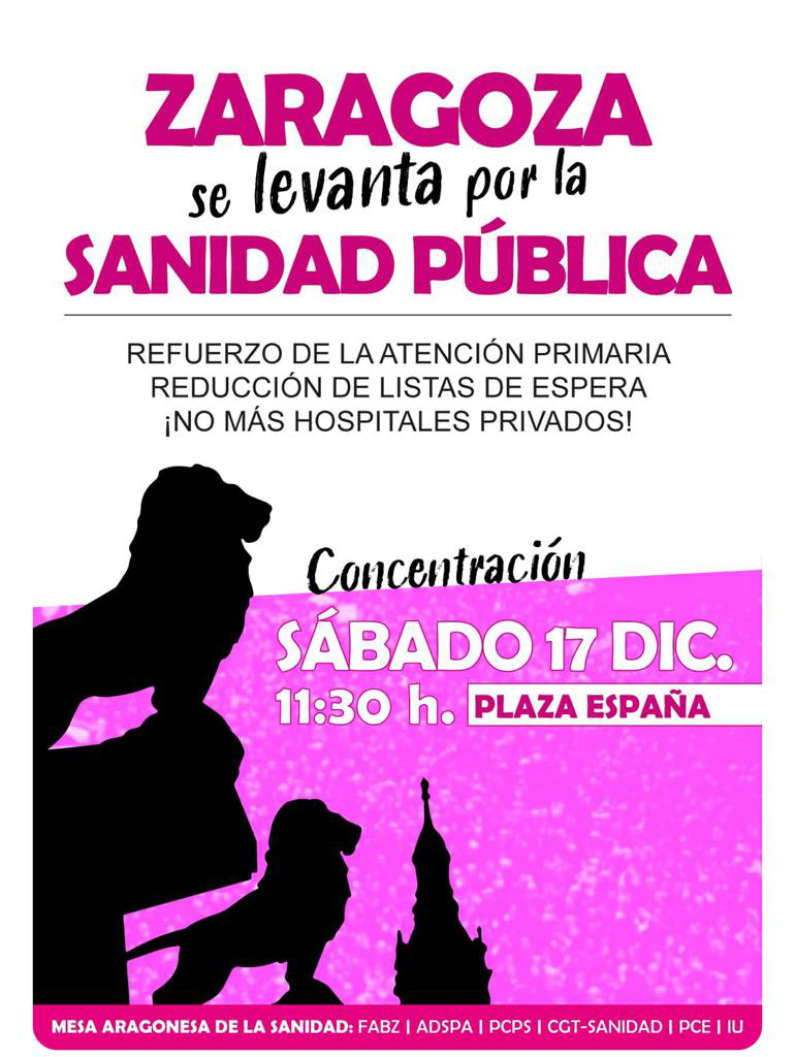 El sábado, 17 de diciembre a las 11:30H se convoca en Plaza España concentración bajo el lema «Zaragoza se levanta por la sanidad pública» exigiendo el refuerzo de la Atención Primaria, la reducción de las listas de espera y ¡No más hospitales privados!