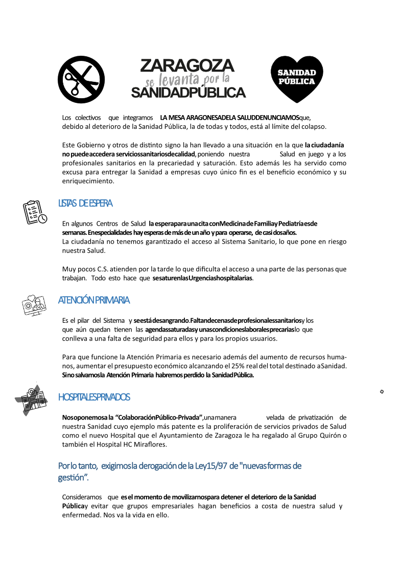 La Mesa Aragonesa de Sanidad hemos convocado esta concentración por la Sanidad Pública y de Calidad. Entendemos que una Sanidad Pública y de Calidad no es posible si no se afrontan aspectos básicos de los que no podemos dar ni un paso atrás.